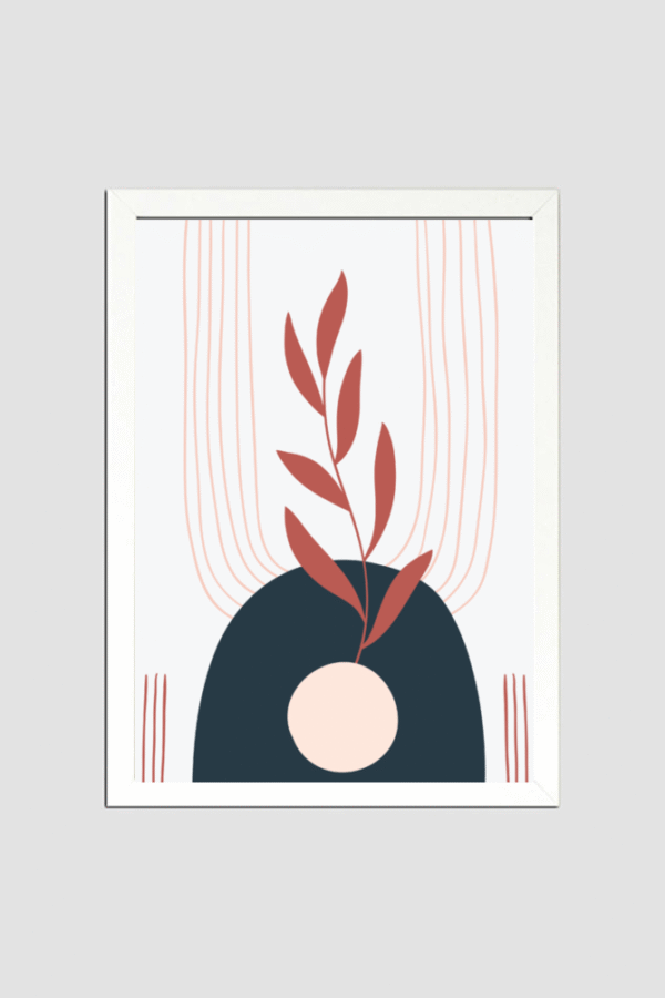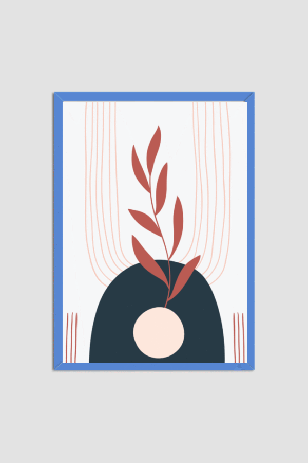 Transform your space with this sophisticated abstract botanical wall art, designed for lovers of minimalism and nature-inspired aesthetics. The artwork features a deep blue arch framing a delicate light pink circle, from which a vibrant red leafy branch emerges—creating a harmonious interplay of form and color. Subtle curved lines in soft pink add fluidity and movement, enriching the composition without overpowering it. Encased in a clean white frame, this piece effortlessly complements contemporary decor styles—from Scandinavian to Japandi. Whether in a cozy home, stylish studio, or professional setting, it brings refined charm and organic elegance to any wall.